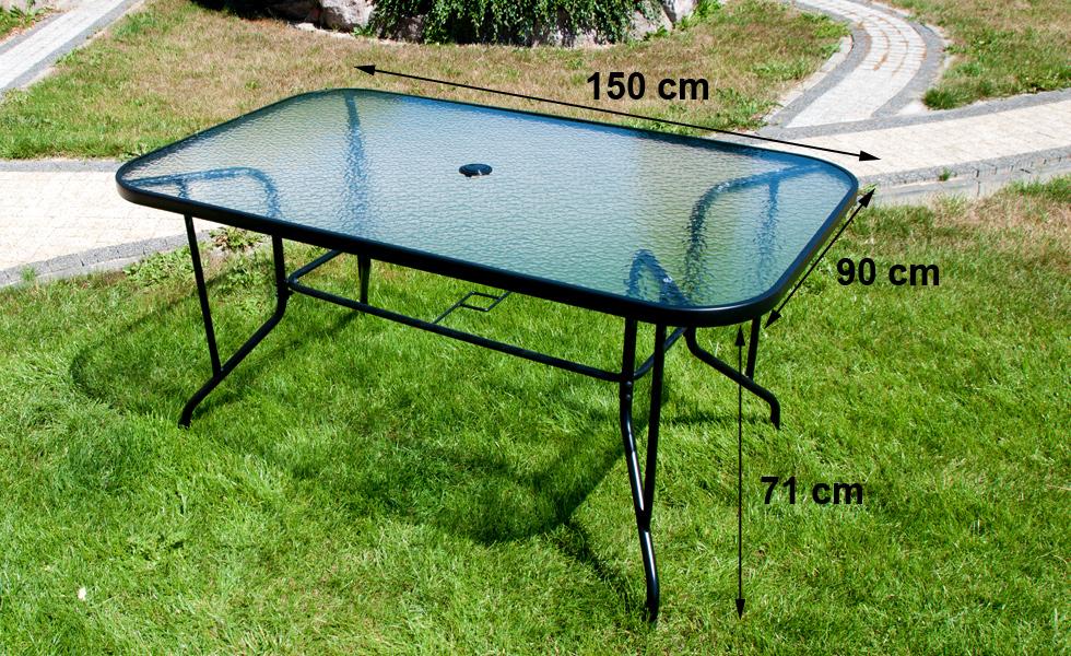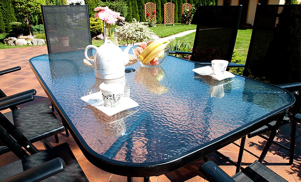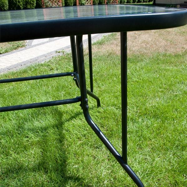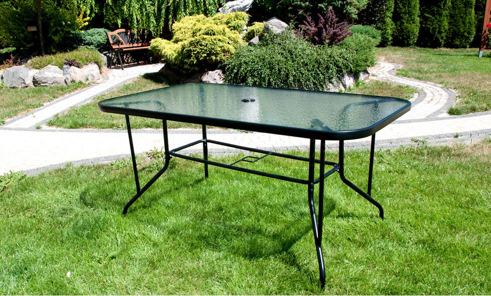 Konstrukcja stołu jest metalowa która została pomalowana farbą proszkową. Blat stołu Torino to hartowane szkło w kolorze bezbarwnym. Szklany blat posiada otwór z zaślepką do umieszczenia parasola